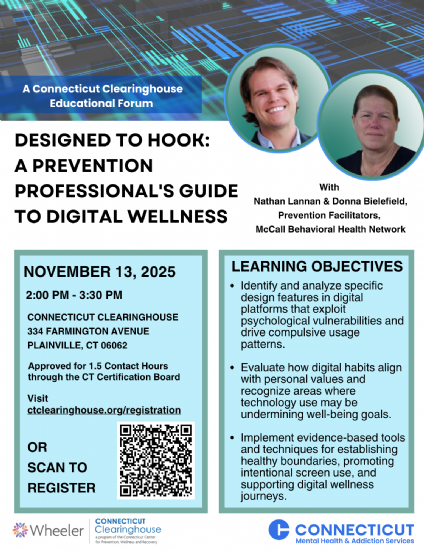 CT Clearinghouse is a comprehensive resource center providing information on substance use and mental health disorders, prevention and health promotion, treatment and recovery, wellness and other related topics. In addition to our online database of up-to-date information, we also offer materials for distribution such as posters and pamphlets, and lend books, DVDs and other media from our specialized library. These resources are available for all Connecticut families, teachers, students, professionals, communities and children.