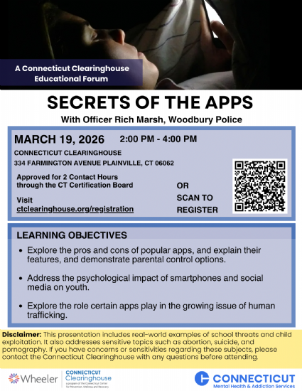 CT Clearinghouse is a comprehensive resource center providing information on substance use and mental health disorders, prevention and health promotion, treatment and recovery, wellness and other related topics. In addition to our online database of up-to-date information, we also offer materials for distribution such as posters and pamphlets, and lend books, DVDs and other media from our specialized library. These resources are available for all Connecticut families, teachers, students, professionals, communities and children.