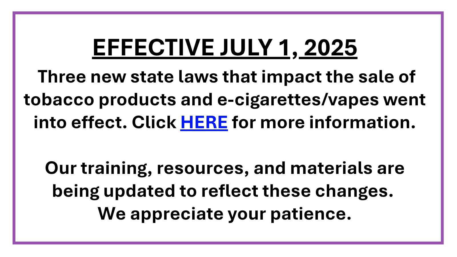 Tobacco and Electronic Cigarette Sales: Do the Right Thing is a free online education program for tobacco and e-cigarette retailers and interested community members. The training provides viewers with the information and skills needed to sell tobacco and e-cigarette/vapor products responsibly to individuals 21 years old or older. Click here to take the online training.