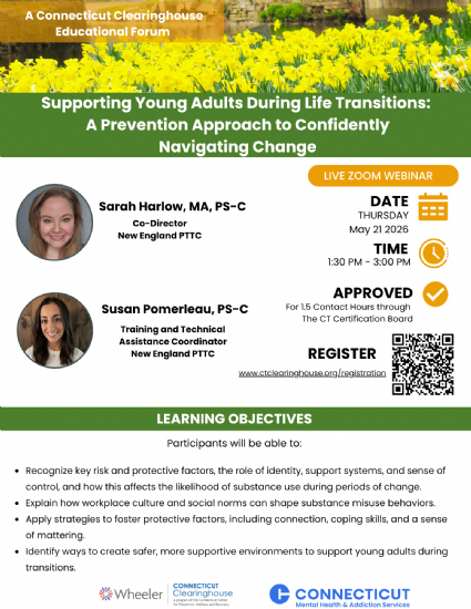 CT Clearinghouse is a comprehensive resource center providing information on substance use and mental health disorders, prevention and health promotion, treatment and recovery, wellness and other related topics. In addition to our online database of up-to-date information, we also offer materials for distribution such as posters and pamphlets, and lend books, DVDs and other media from our specialized library. These resources are available for all Connecticut families, teachers, students, professionals, communities and children.