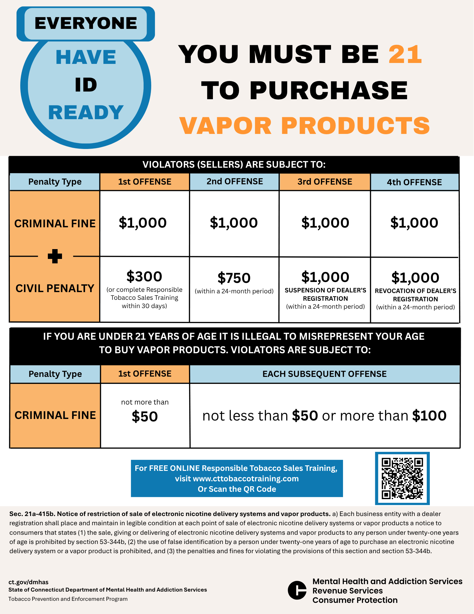 Our "Have ID Ready" door decals and "21" cash register/counter stickers tell customers they must be 21 years old or older to buy tobacco and vapor products and let customer know that staff will ask for their IDs to make sure they are 21 or older.
