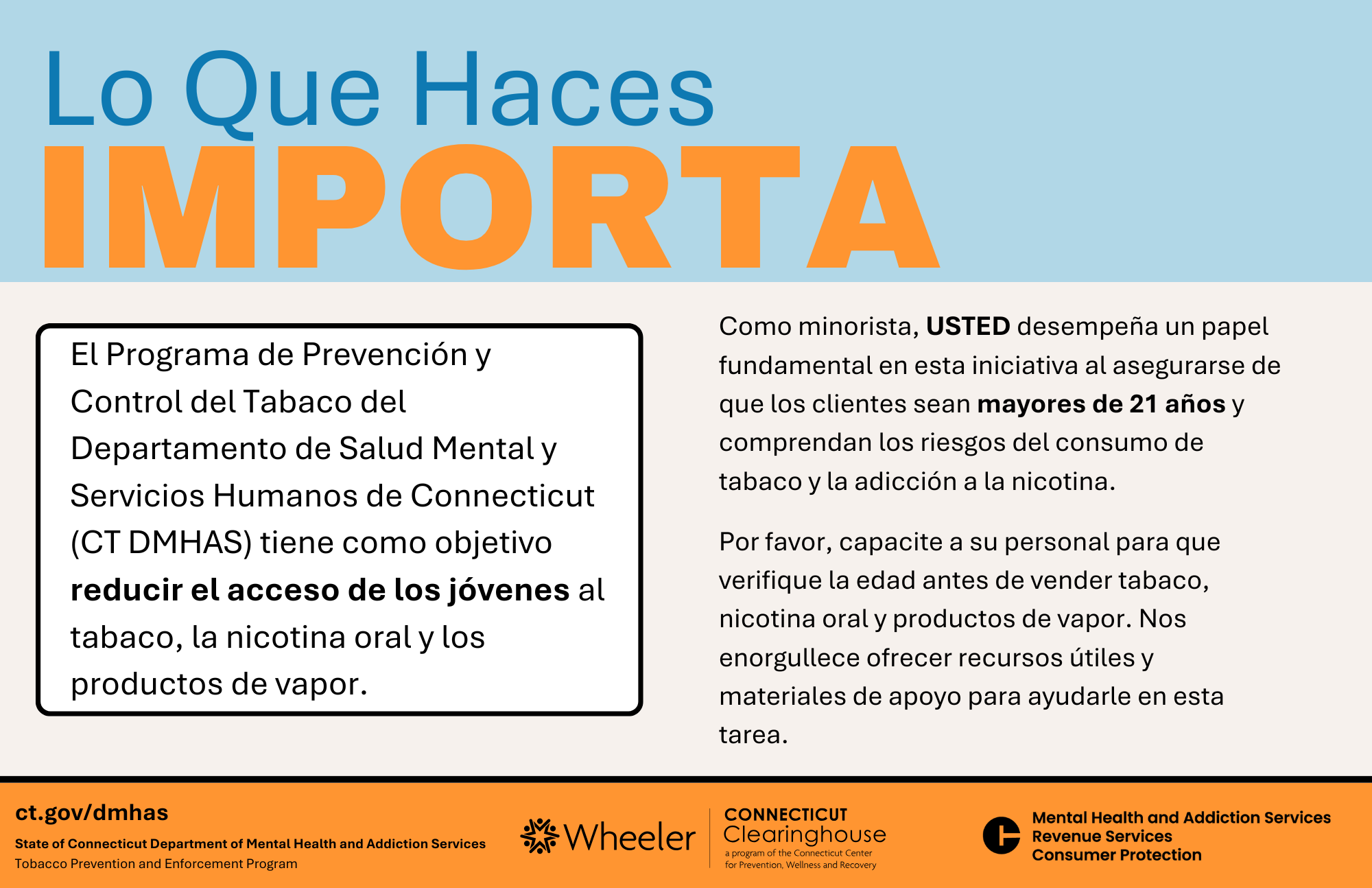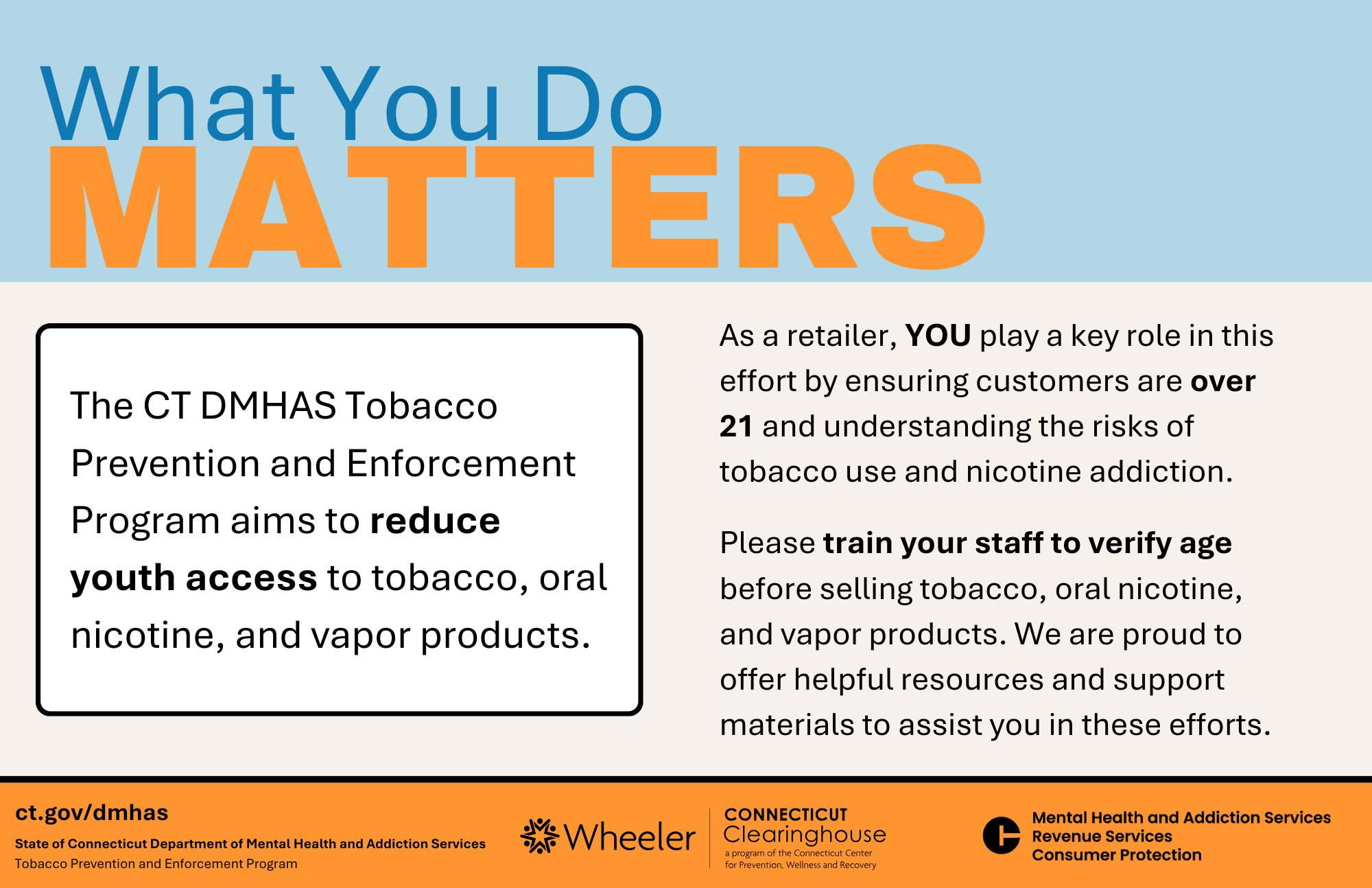 Our "What You Do Matters" double-sided postcard provides retailers with information and links to resources that support the responsible sale of tobacco and vapor products.